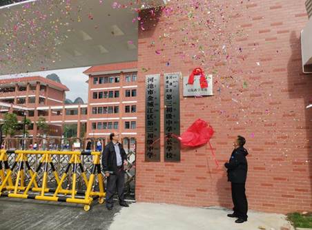 贺卫国副校长与金城江区第三中学莫海斌校长一同揭牌,共同庆祝基地建设成功(张陆凤 摄)