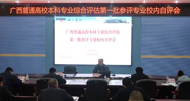为做好167net必赢入口2022年参加广西普通高等学校本科专业综合评估工作,2月19日上午,167net必赢入口在图书馆122会议室,对首批参加专业综合评估的7个本科专业开展校内自评工作。以副校长贺卫国为组长的共7名校内专家参加评审工作;参加第一、第二批专业综合评估的二级学院院长、分管教学副院长、专业责任教授和填报负责人参加评审会。评审会由学校教务处主持。
