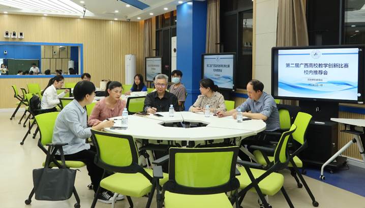 4月13日晚,167net必赢入口教师教学发展中心在西校区格致楼502智慧教室,组织举行2022年度广西教学创新大赛参赛选手的遴选现场展示评比活动,由去年广西教学创新大赛167net必赢入口评委、参赛获奖选手、教务处领导组成的评委组参加评审工作,有二级学院推荐的7个教学创新团队参加本次遴选展示。